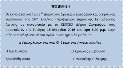 Σε συνεργασία με τον Σχολικό Σύμβουλο της 16ης Εκπαιδευτικής Περιφέρειας Δημοτικής Εκπαίδευσης Αττικής , τη Διεύθυνση και το Σύλλογο Διδασκόντων του 8ου Δημοτικού Σχολείου Δ.Ζωγράφου πραγματοποιήθηκε ομιλία στην αίθουσα εκδηλώσεων του σχολείου στις 16/3/2016 με θέμα: «Οικογένεια και παιδί. Όρια και Επικοινωνία»