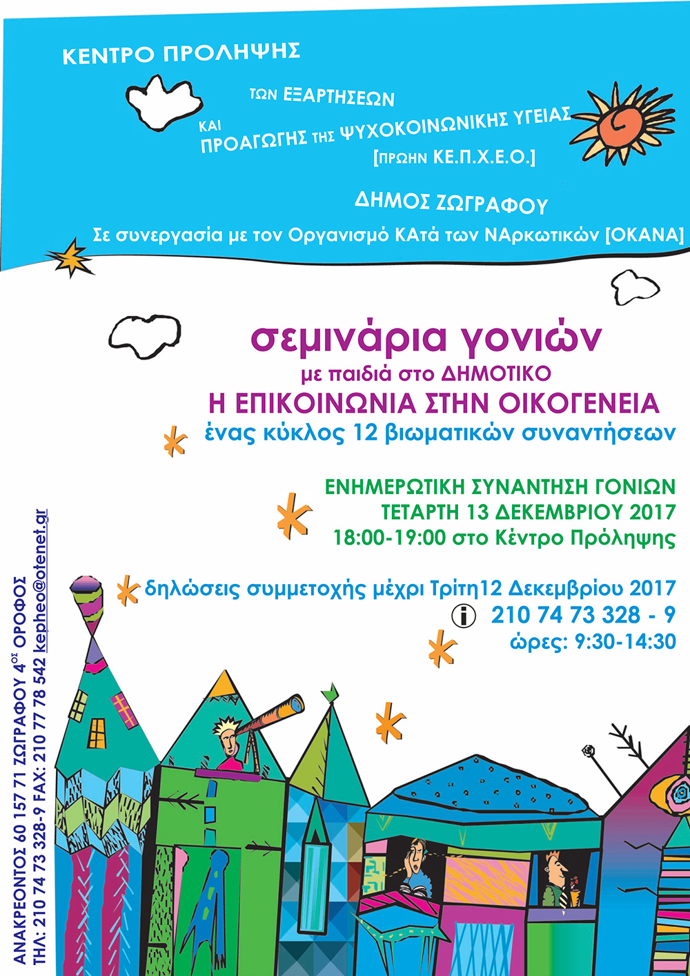 Το Κέντρο Πρόληψης Δ.Ζωγράφου διοργανώνει και φέτος σεμινάρια για γονείς παιδιών δημοτικού με θέμα «Η Επικοινωνία στην Οικογένεια».