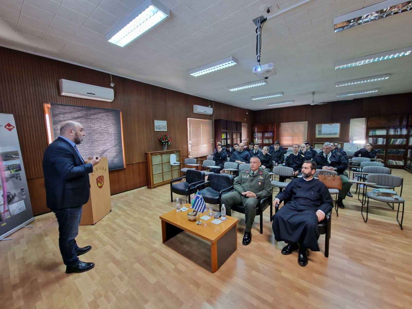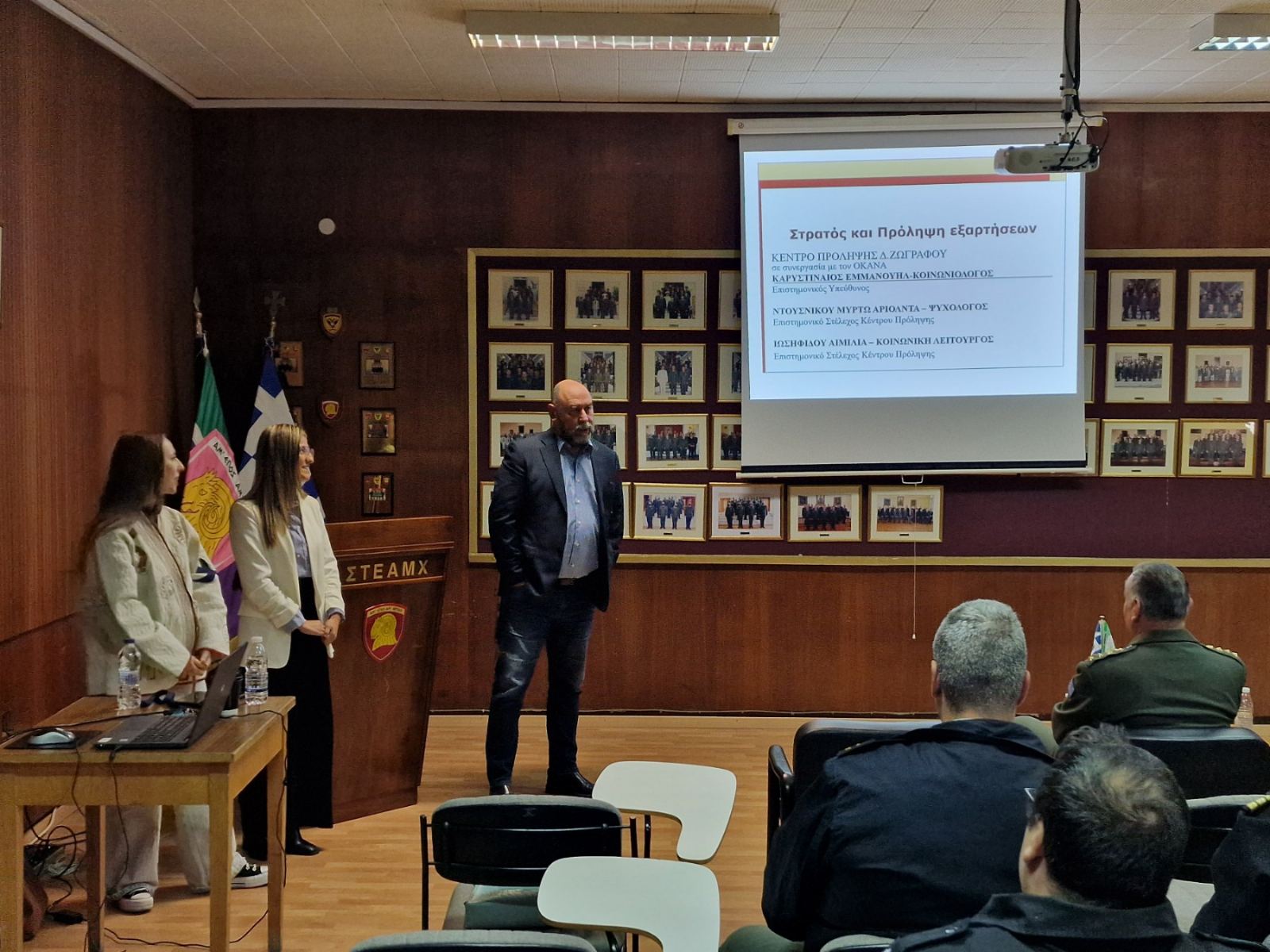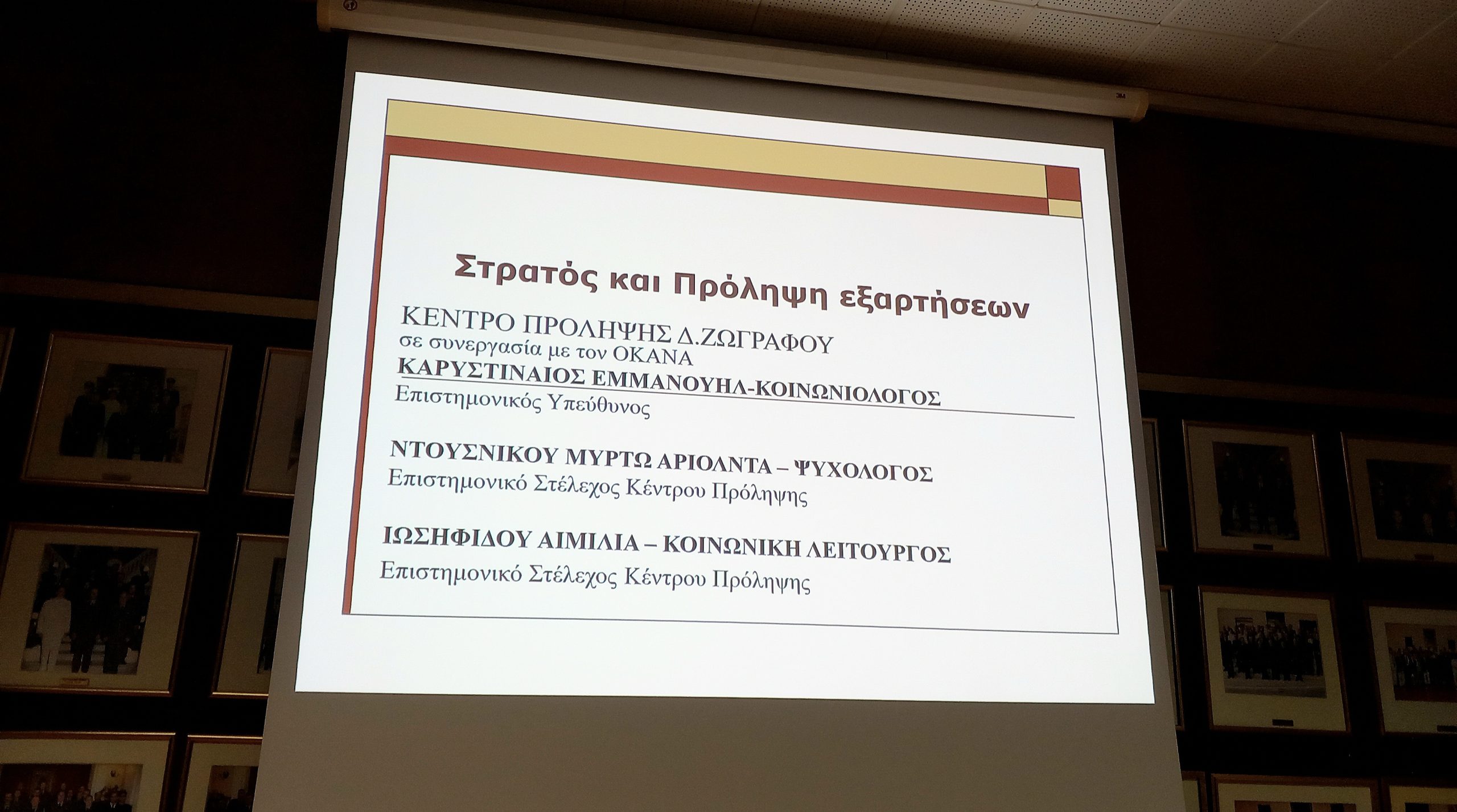 Την Πέμπτη 07 Νοεμβρίου πραγματοποιήθηκε διάλεξη με θέμα “Εφαρμογή Προγραμμάτων Πρόληψης εξαρτητικών συμπεριφορών και Ένοπλες Δυνάμεις” στους σπουδαστές της Σχολής Τεχνικής Εκπαίδευσης Αξιωματικών Μηχανικού (ΣΤΕΑΜΧ) από τον επιστημονικά υπεύθυνο και στελέχη του Κέντρου Πρόληψης Δ. Ζωγράφου.